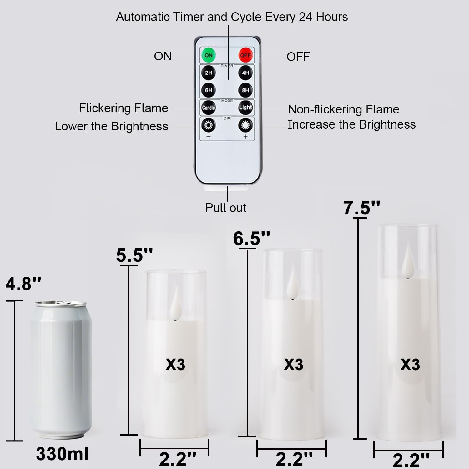 - Package Include: This battery operated candle set includes 9 flameless pillar candles( D2.2βx H5β6β7β), two 10-key remote control, one user manual. Each flameless candle powered by 2 x AA batteries (not included) which can last for 500+ hours