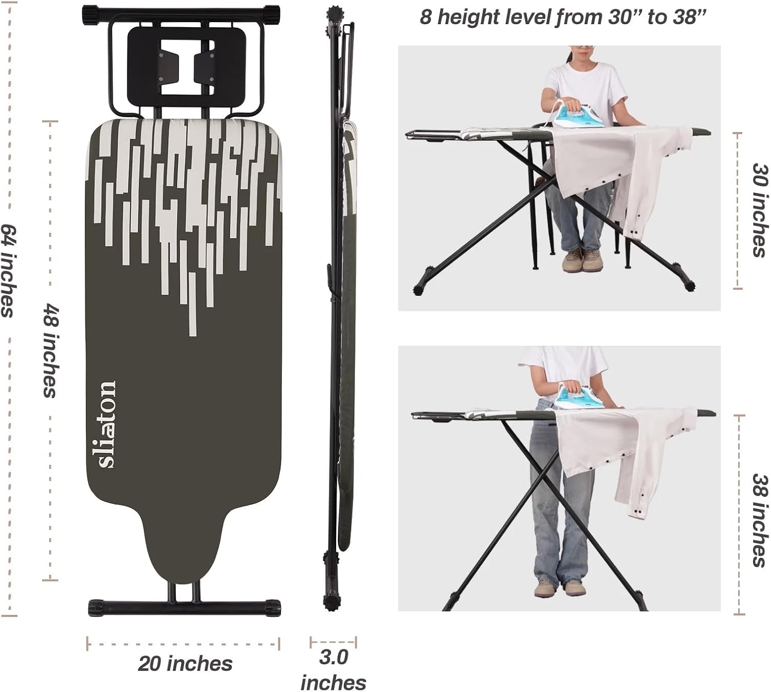- Adjustable Height - This ironing board offers multiple height adjustments ranging from 30" to 36". Whether you prefer standing or sitting while ironing, or sharing it with someone of different heights, It's the ideal choice for both men and women.