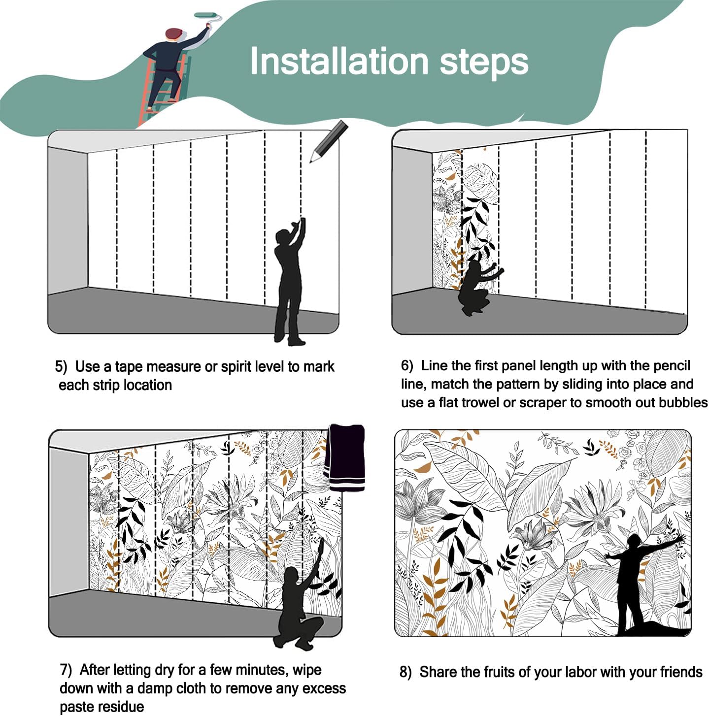 - Mural wallpaper size: 140 "W x 91 "H, divided into 7 sections, each section is labeled with a number underneath, there is no need to overlap the pattern when installing, just install according to the number labeled underneath the panel