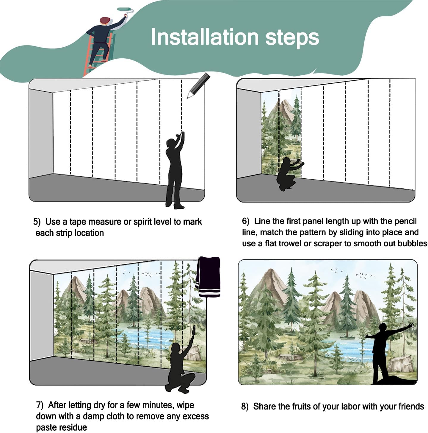 - Mural wallpaper size: 180 "W x 115 "H, divided into 9 sections, each section is labeled with a number underneath, there is no need to overlap the pattern when installing, just install according to the number labeled underneath the panel