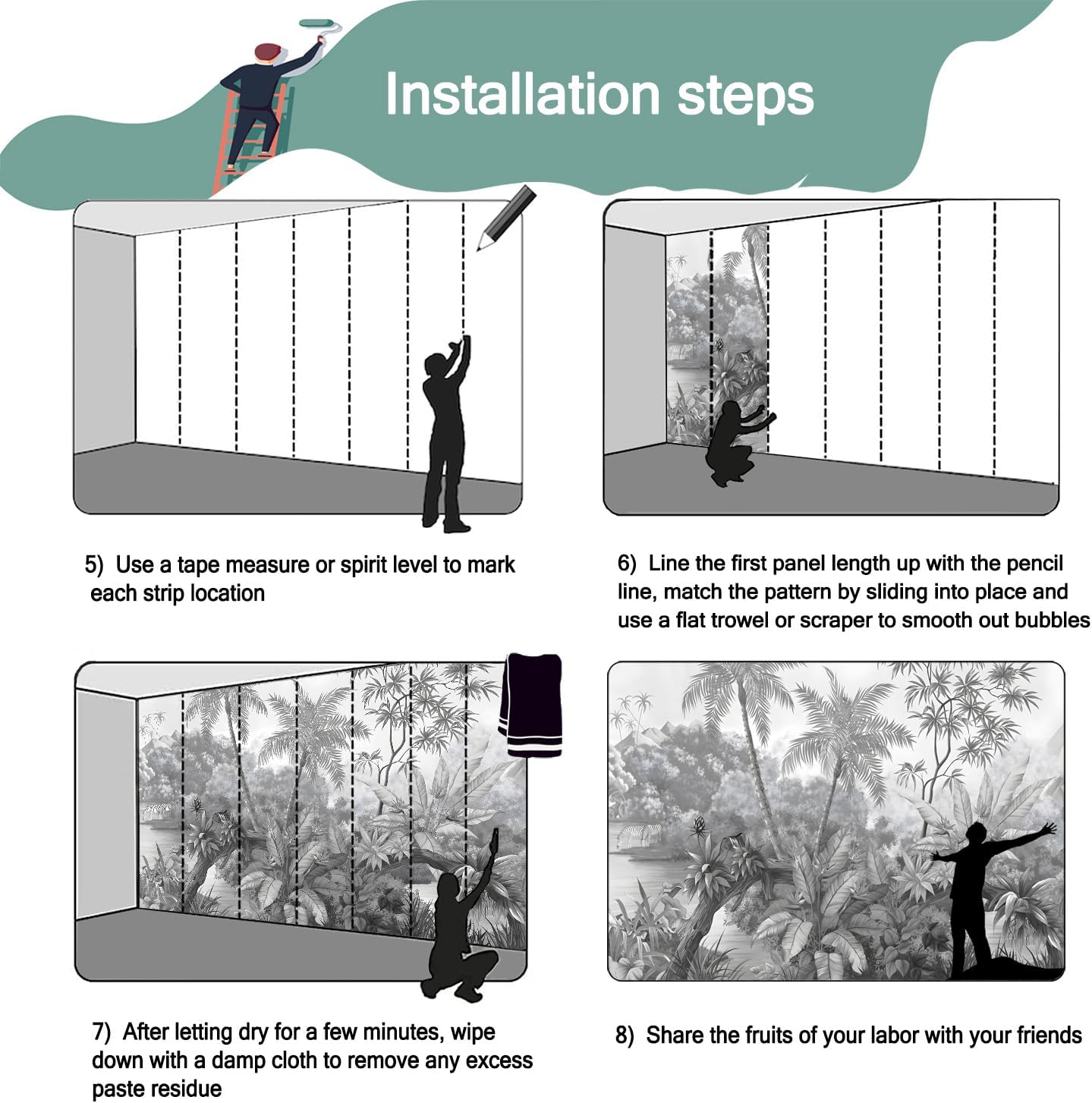 - Mural wallpaper size: 140 "W x 91 "H, divided into 7 sections, each section is labeled with a number underneath, there is no need to overlap the pattern when installing, just install according to the number labeled underneath the panel