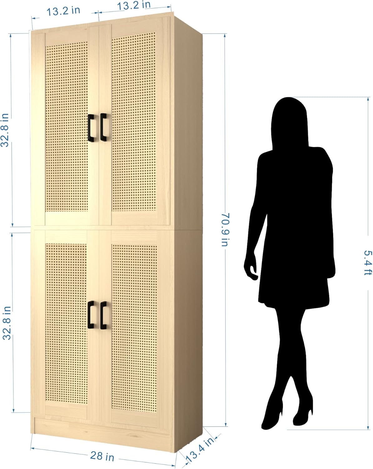 - ✔Multifunctional Storage Cabinet. Our DIYART Rattan kitchen pantry works as good as a storage unit and is suitable to use in many different ways at home, such as hallway cabinet or file cabinet in the office. Overall Dimensions: 28"W x 70.9"H x 13.4"D.