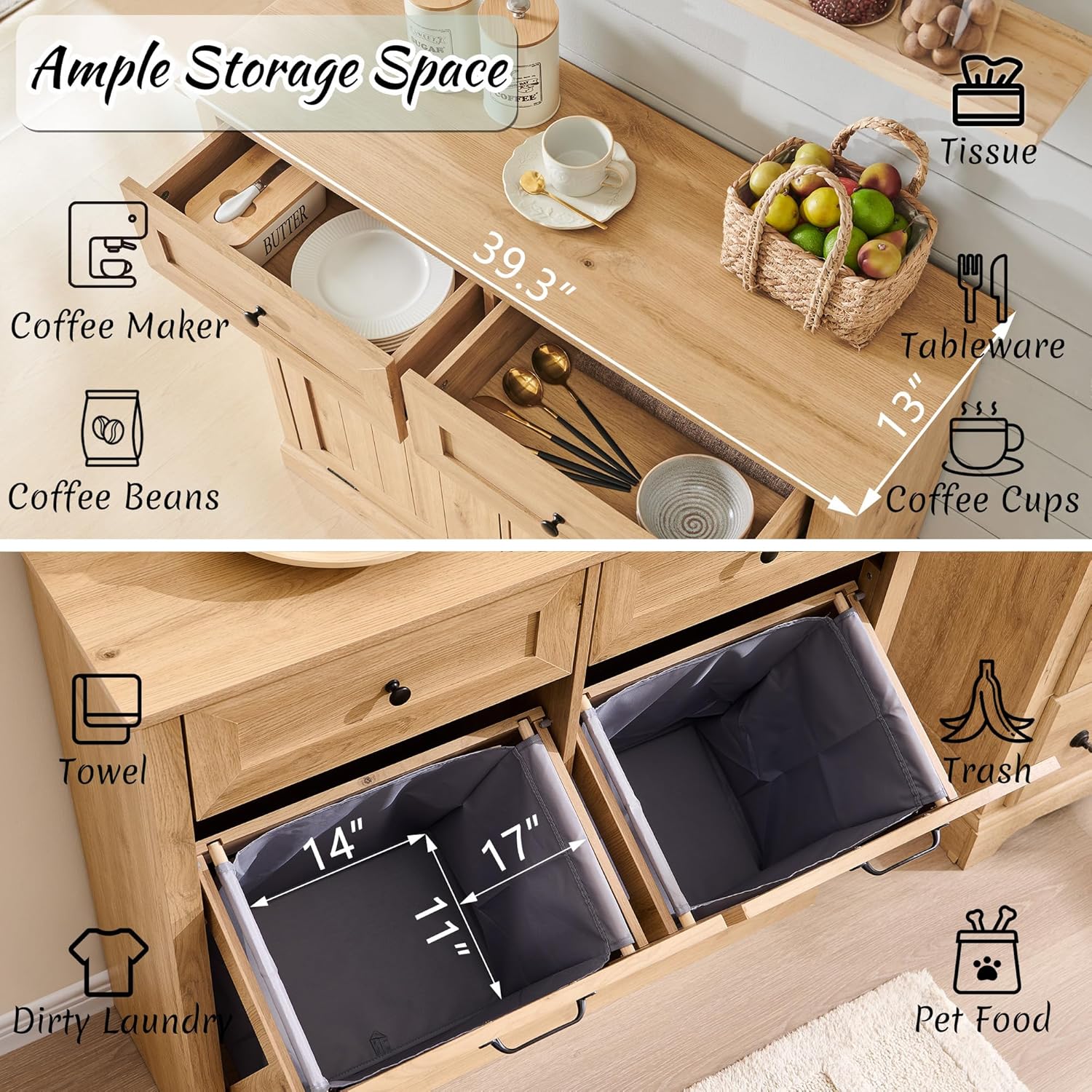Double Tilt Out Laundry Hamper Cabinet, 20 Gallon Farmhouse Trash Can Cabinet with Drawer, Hidden Wood Garbage Can Bin Cabinets with Laundry Storage Basket for Bathroom, Kitchen (Natural)