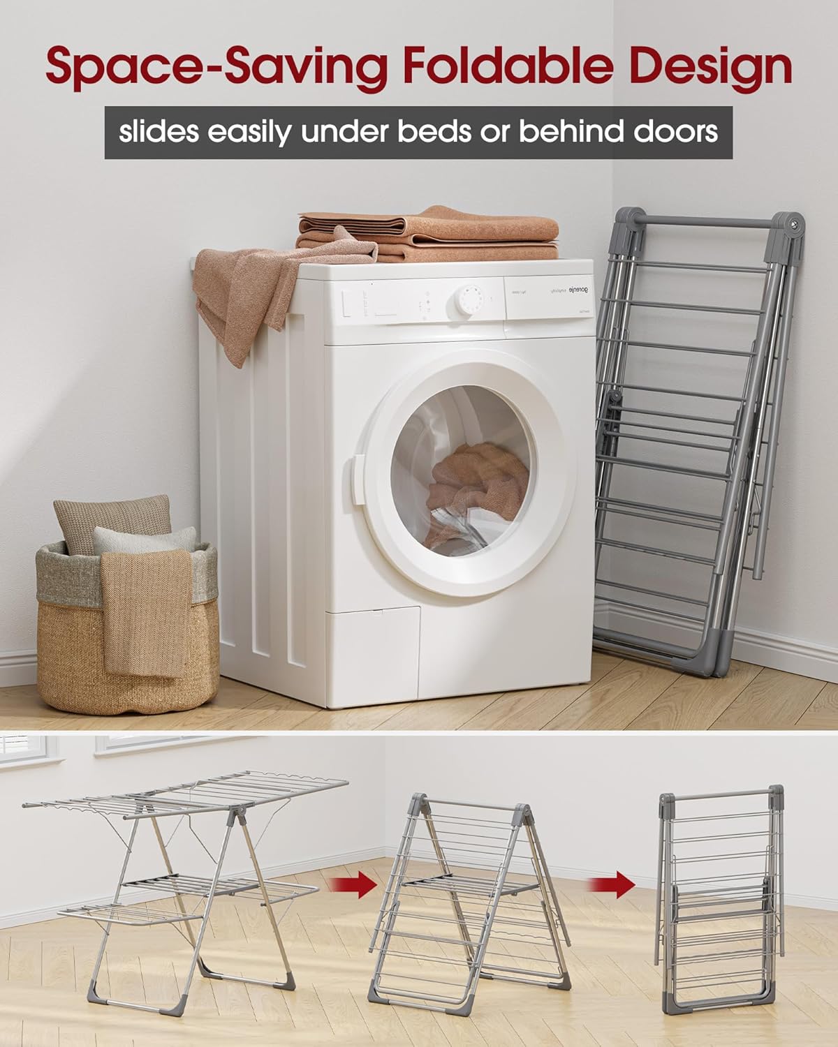- FLEXIBLE DRYING: This clothes rack for drying includes two spacious layers and four adjustable height levels to accommodate everything from short garments to long coats and dresses. It also lays flat to dry quilts and bedding. Whether for daily laundry or seasonal use, this laundry rack for drying clothes handles large loads with ease.
