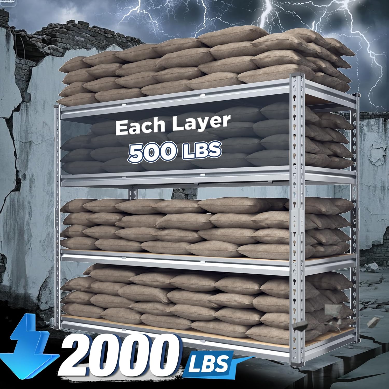 - ăGarage Shelving - 2000LBS CapacityăREIBII garage shelves are built like a tank! Thick steel legs and chunky boards can carry 500lbs on each shelf â that's 2000lbs total! Suit for stacking toolboxes, car parts, or even your camping gear. No wobbling, no bending, just rock-solid storage