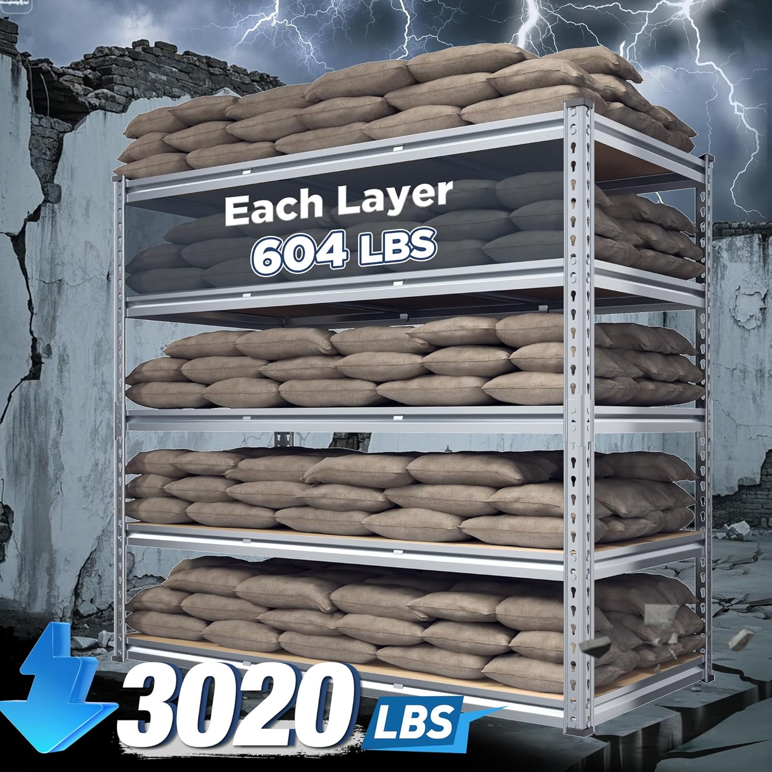 - ăGarage Shelving Heavy Duty - 3020LBS CapacityăREIBII garage shelves are built like a tank! Thick steel legs and chunky boards can carry 604lbs on each shelf â that's 3020lbs total! Suit for stacking toolboxes, car parts, or even your camping gear. No wobbling, no bending, just rock-solid storage