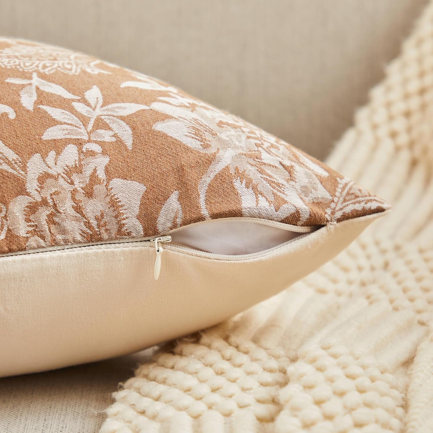 Floral Jacquard Throw Pillow Covers Set of 2, Background/Caramal 16x16 Inch, Farmhouse Decorative Cotton Caramal Cushion Covers for Sofa Bed Living Room Home Decor