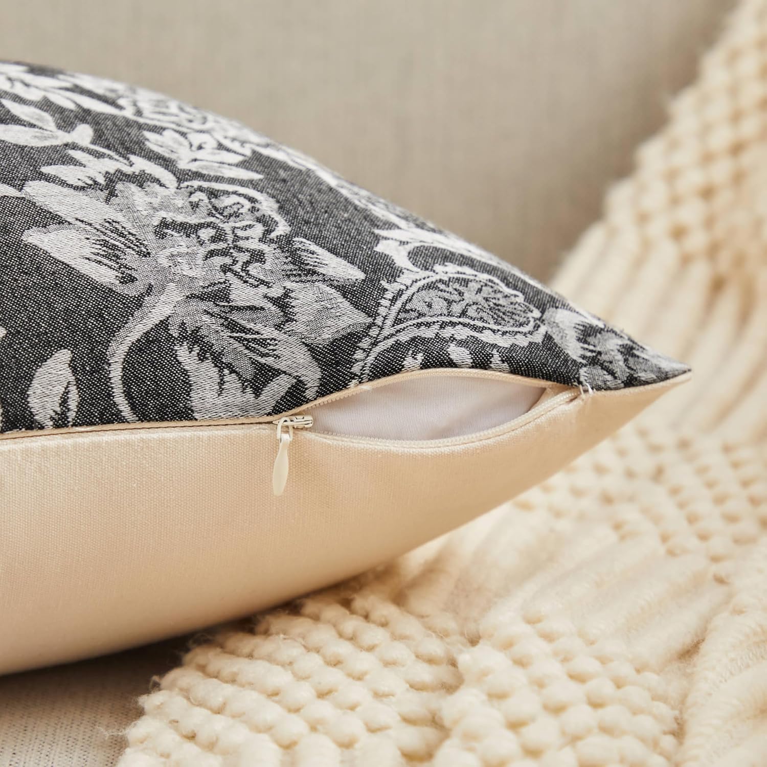 Floral Jacquard Throw Pillow Covers Set of 2, Background/Charcoal 24x24 Inch, Farmhouse Decorative Cotton Dark Grey Cushion Covers for Sofa Bed Living Room Home Decor
