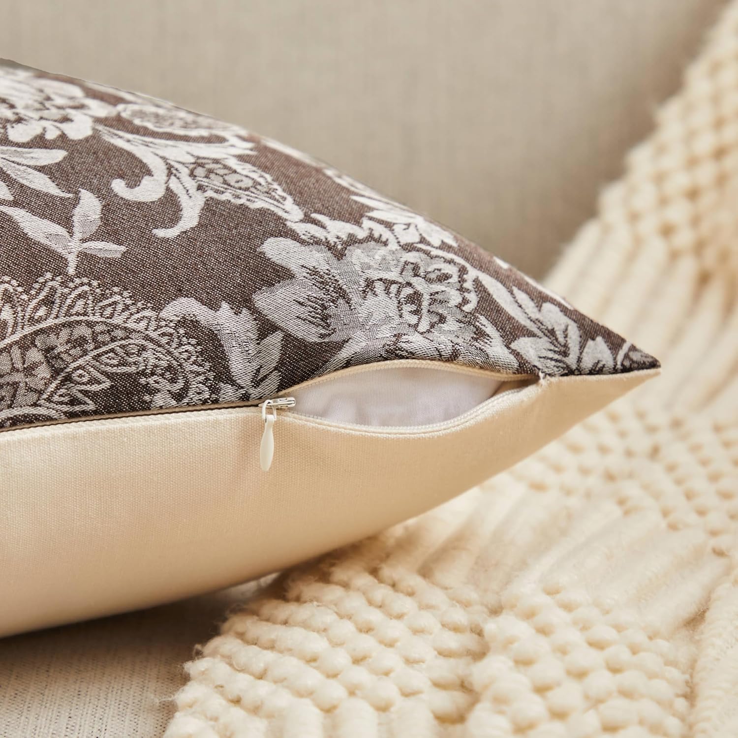 Floral Jacquard Lumbar Throw Pillow Covers Set of 2, Background/Chocolate 12x20 Inch, Farmhouse Decorative Cotton Dark Brown Cushion Covers for Sofa Bed Living Room Home Decor