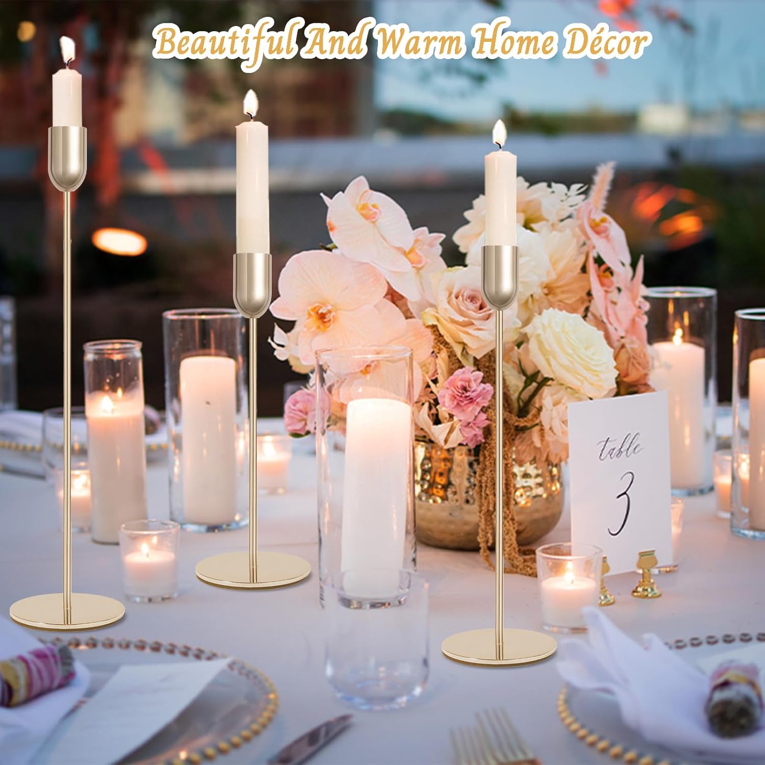 - [Wide Application] You can put these beautiful gold candlestick holders on the dining table,mantelpiece or anywhere you like. They are perfect for decorating your home, living room, fireplace, dining table, bar, garden, shop, restaurant, café, bar, etc., and can also be used as decoration or gift for occasions such as wedding banquets, Christmas, New Year, birthdays, anniversaries, housewarming parties, etc.