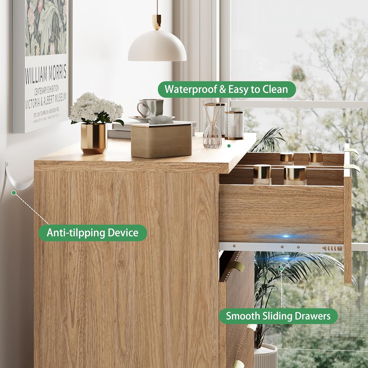 - ăModern Chic AppearanceăThe unique wave-like fluted panel enhances the texture and elegance of this bedroom dresser. The thick table top features natural wood grain that complements the natural oak finish. The wide metal handle and splayed base legs add a modern touch, creating a personalized and distinctive appearance