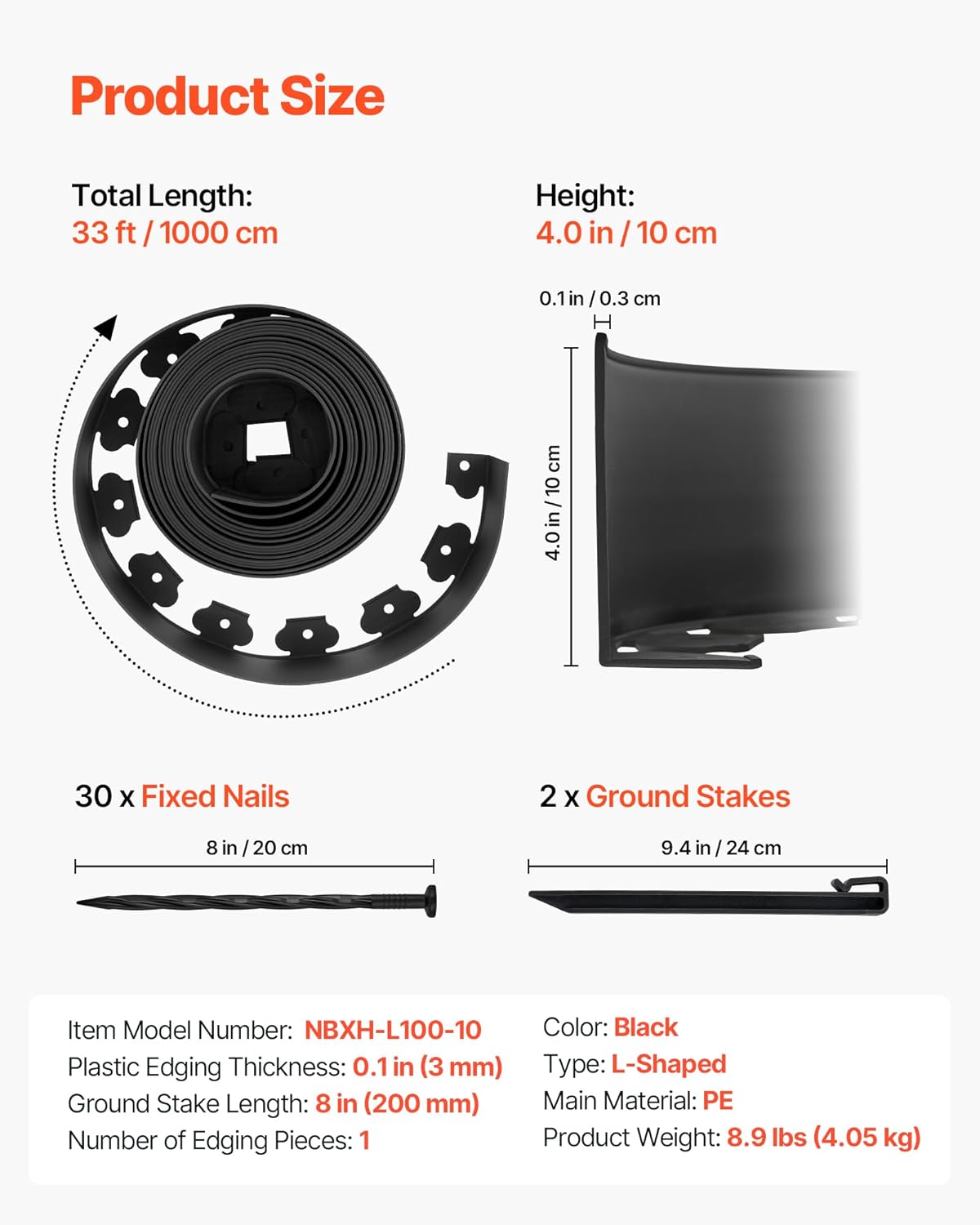 - 33 ft x 4 in Garden Edging: This 33 ft flexible landscape edging strip is ideal for medium-sized yards, lawns, and tree ring borders. The 4 in raised height effectively blocks grass root spread and keeps garden boundaries neat.